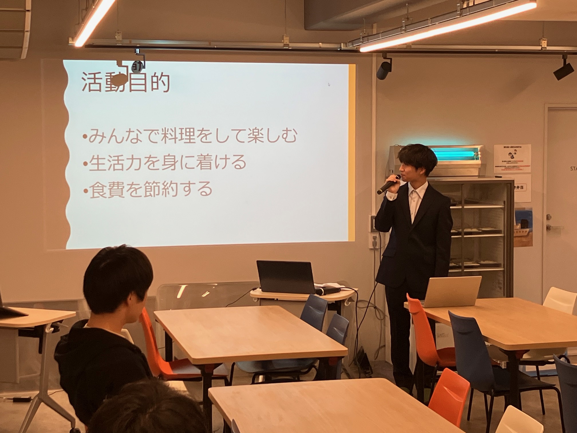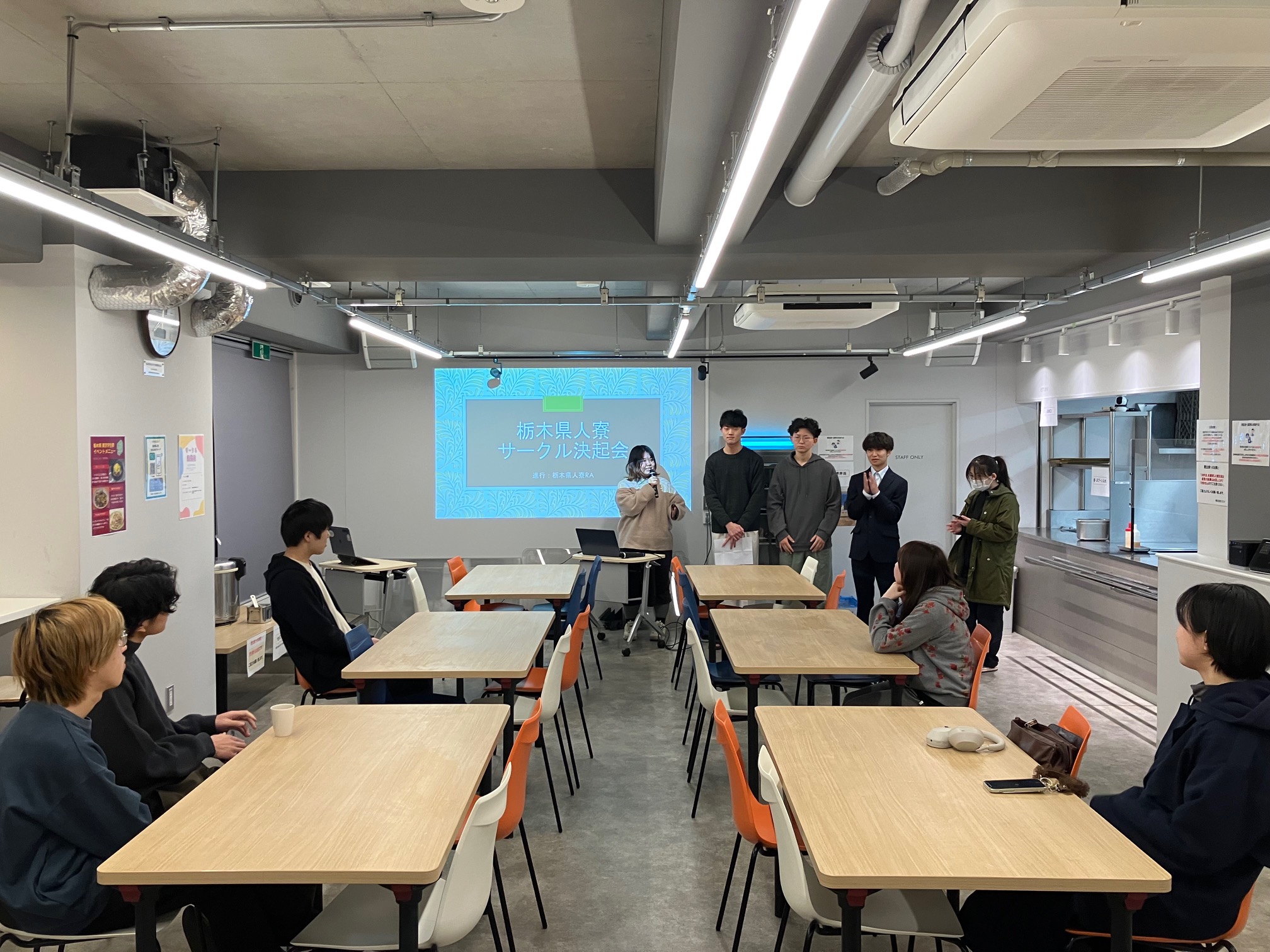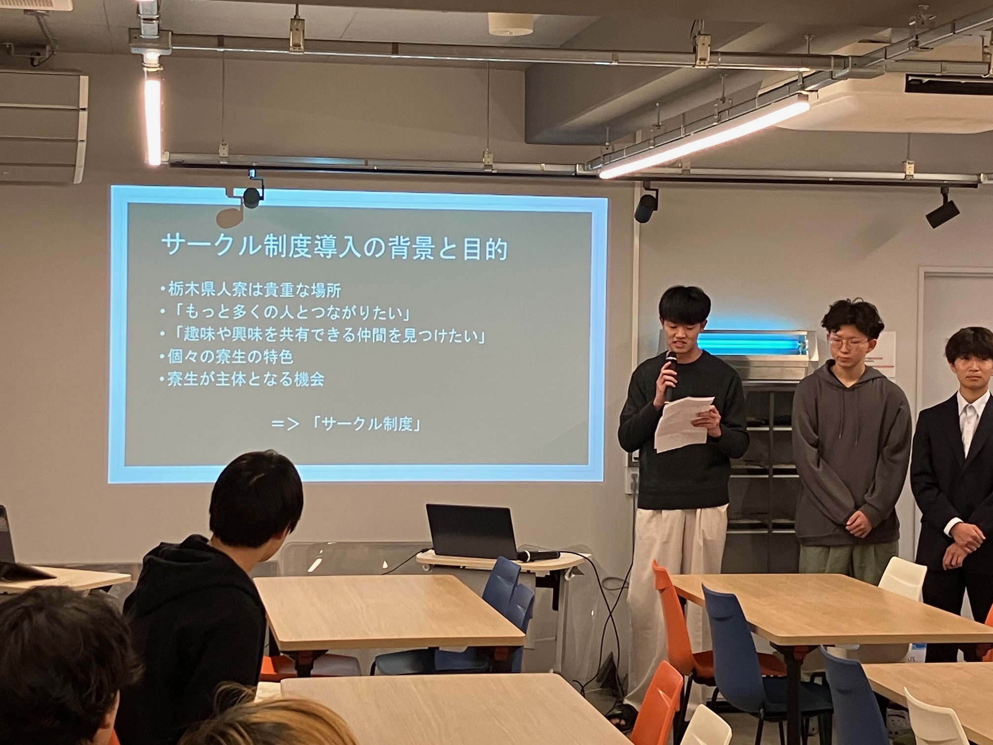 サークル制度の説明と各サークル代表者によるサークル紹介(料理研究、バドミントンなど6サークル)を行いました。