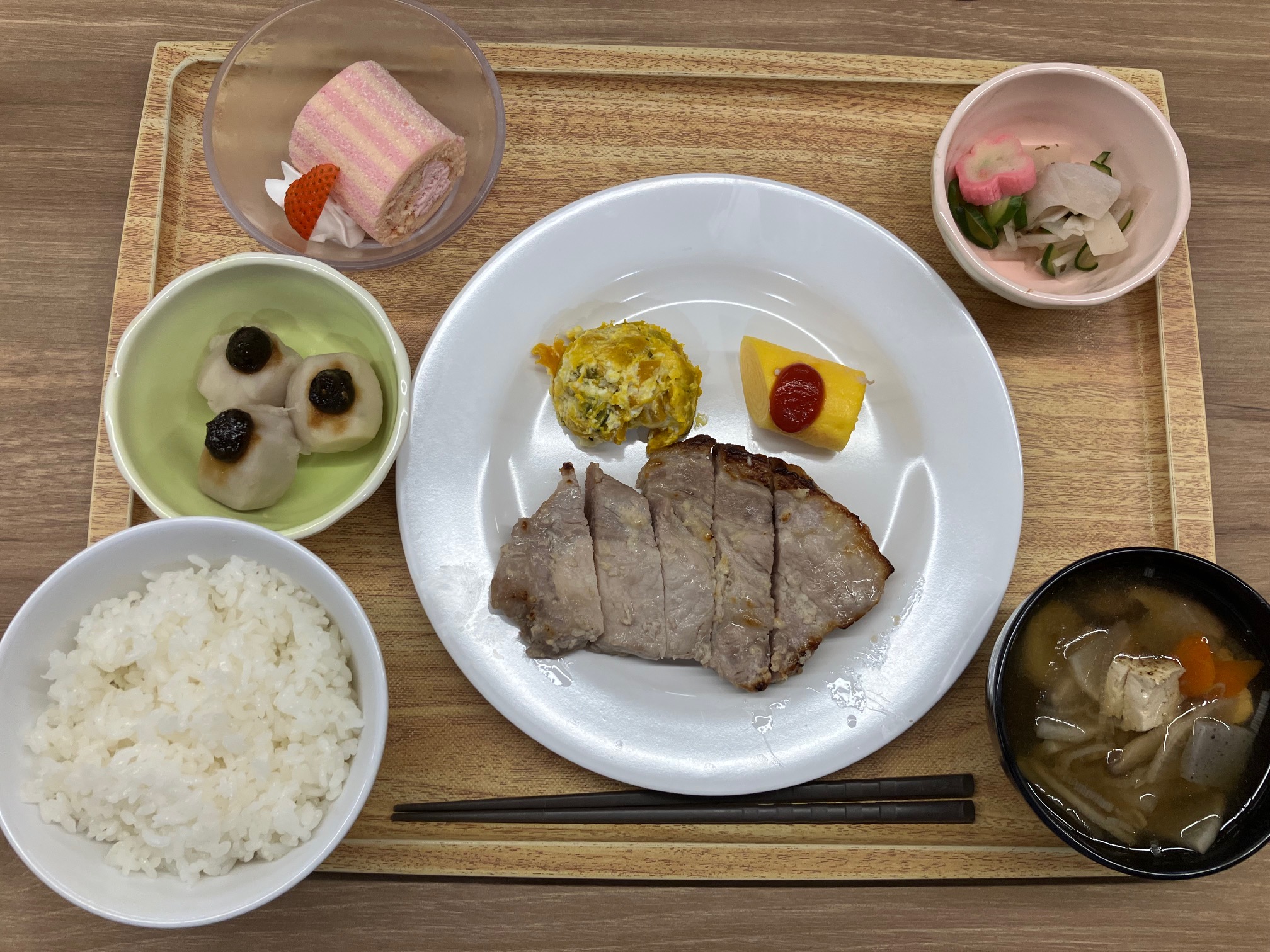 ・栃木ポーク塩麹焼き ・かに風味玉子巻 ・里芋の田楽 ・かんぴょうの和え物 ・けんちん汁 ・ごはん ・苺のデザート