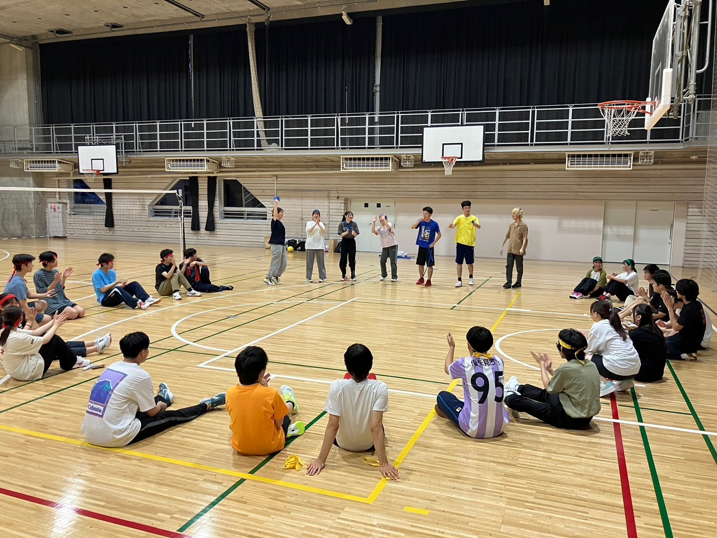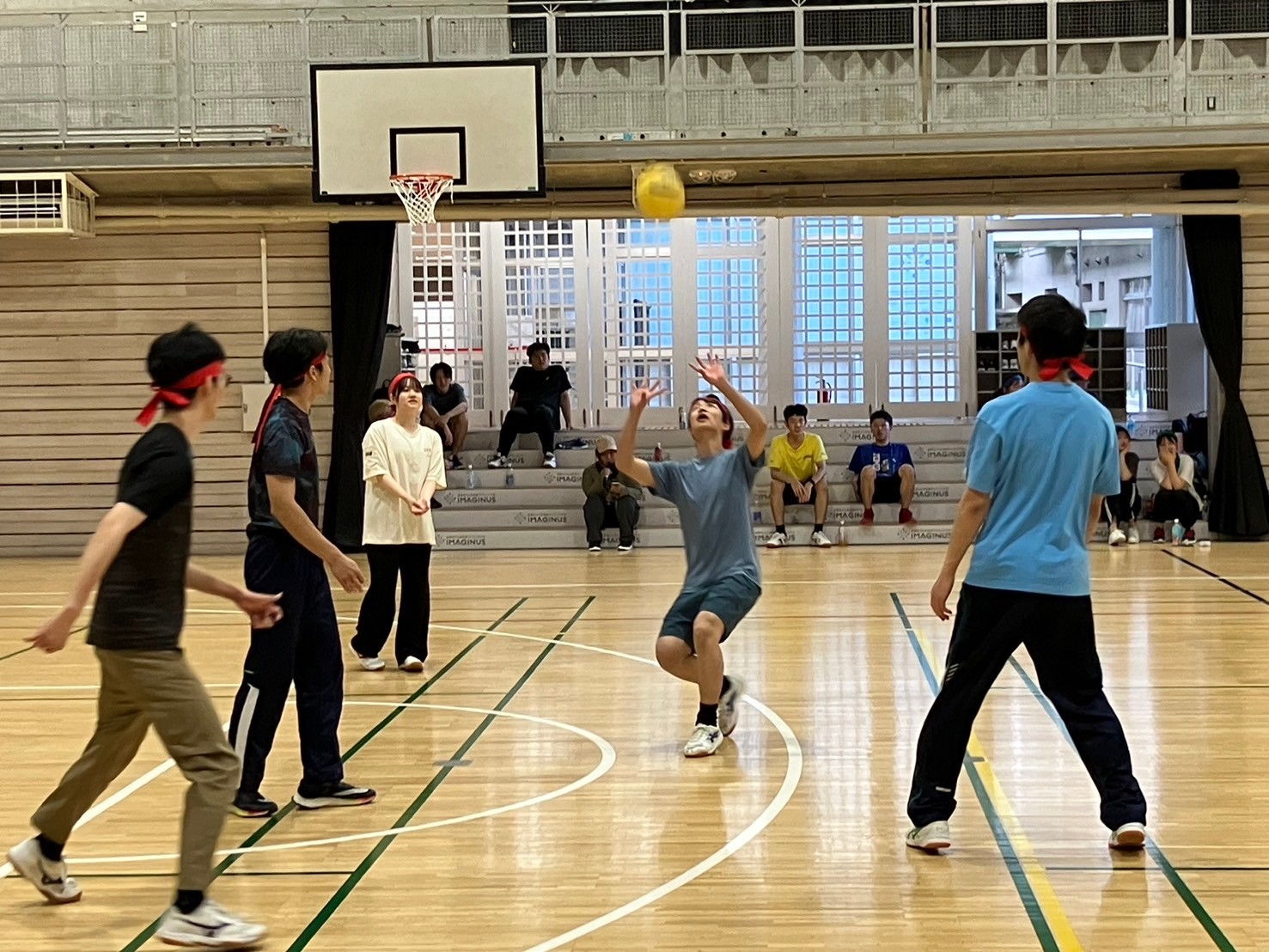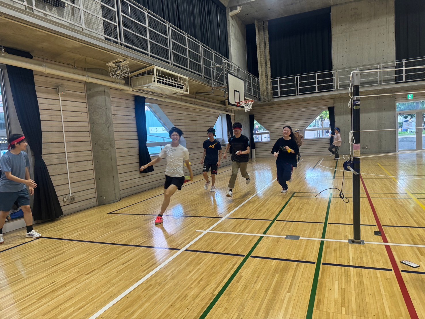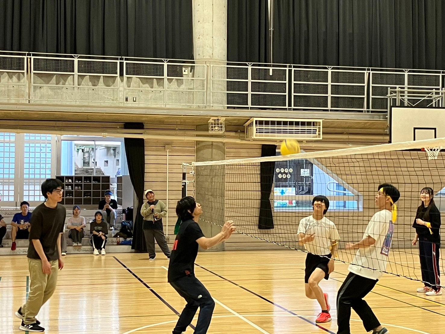 通常より小さく柔らかいボールを使ったバレーボールです。様々な独自ルールを設け、楽しみました。