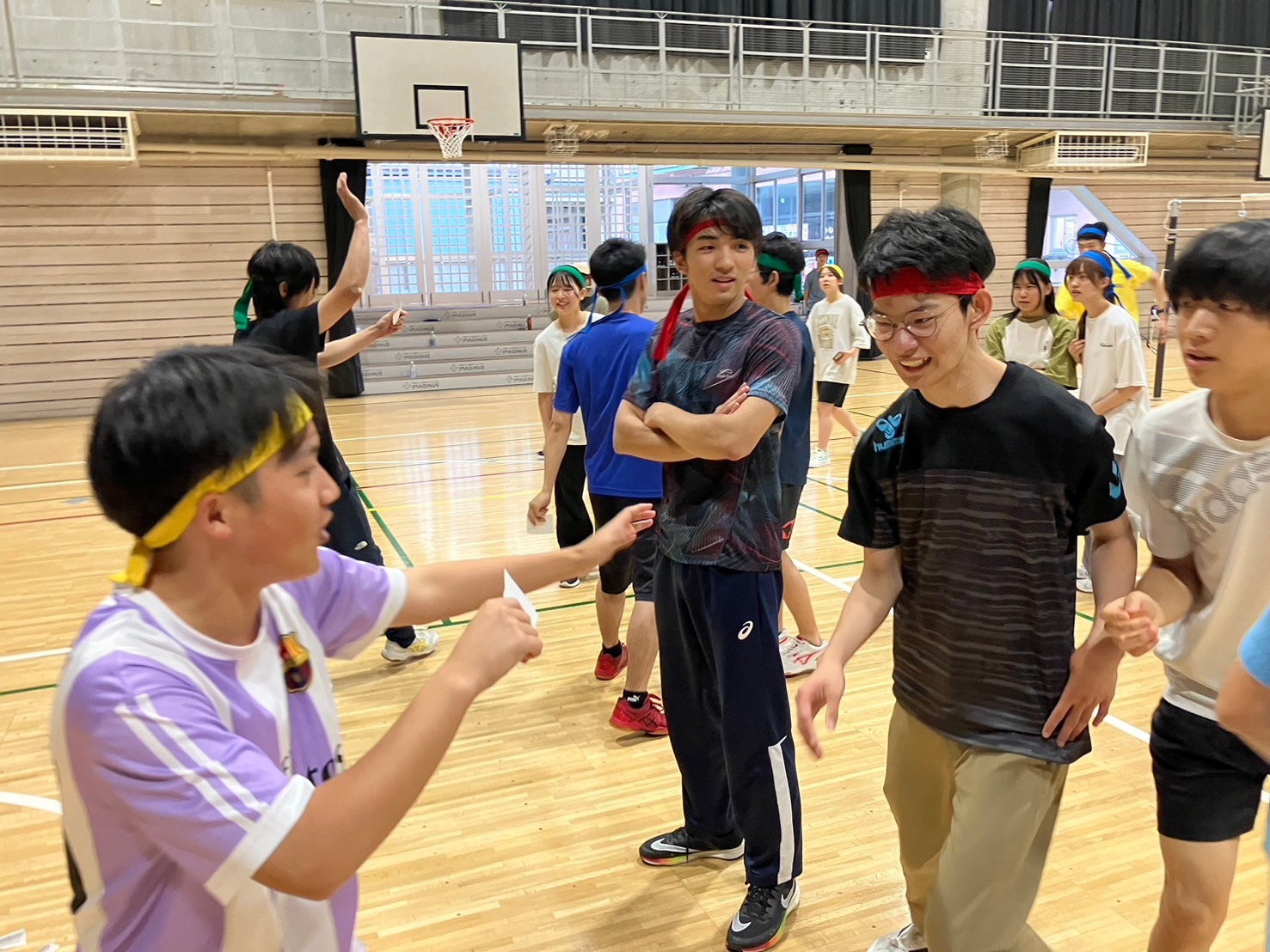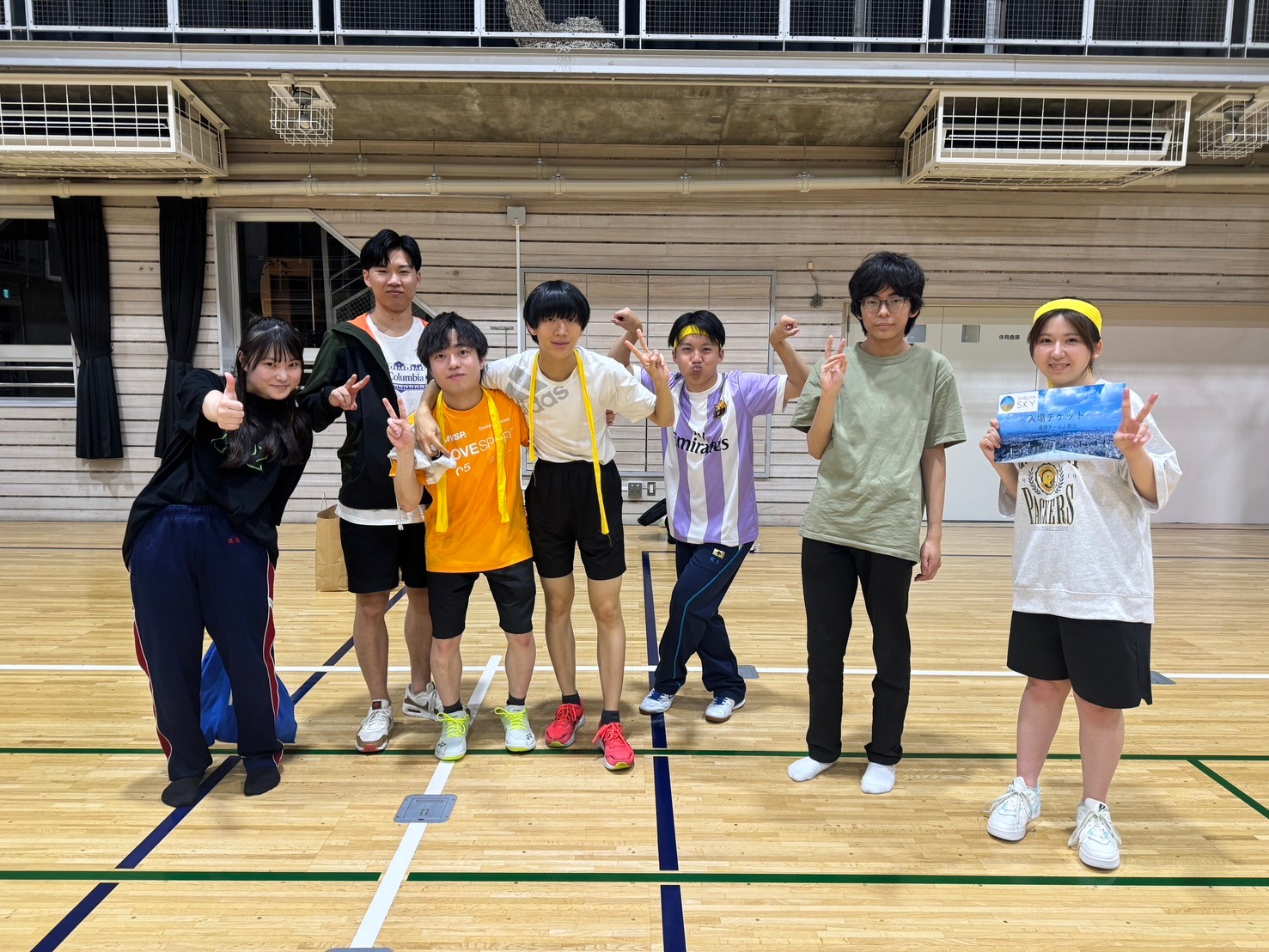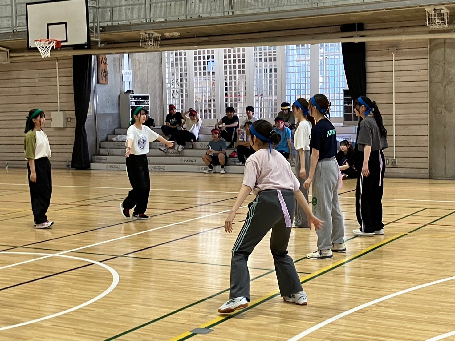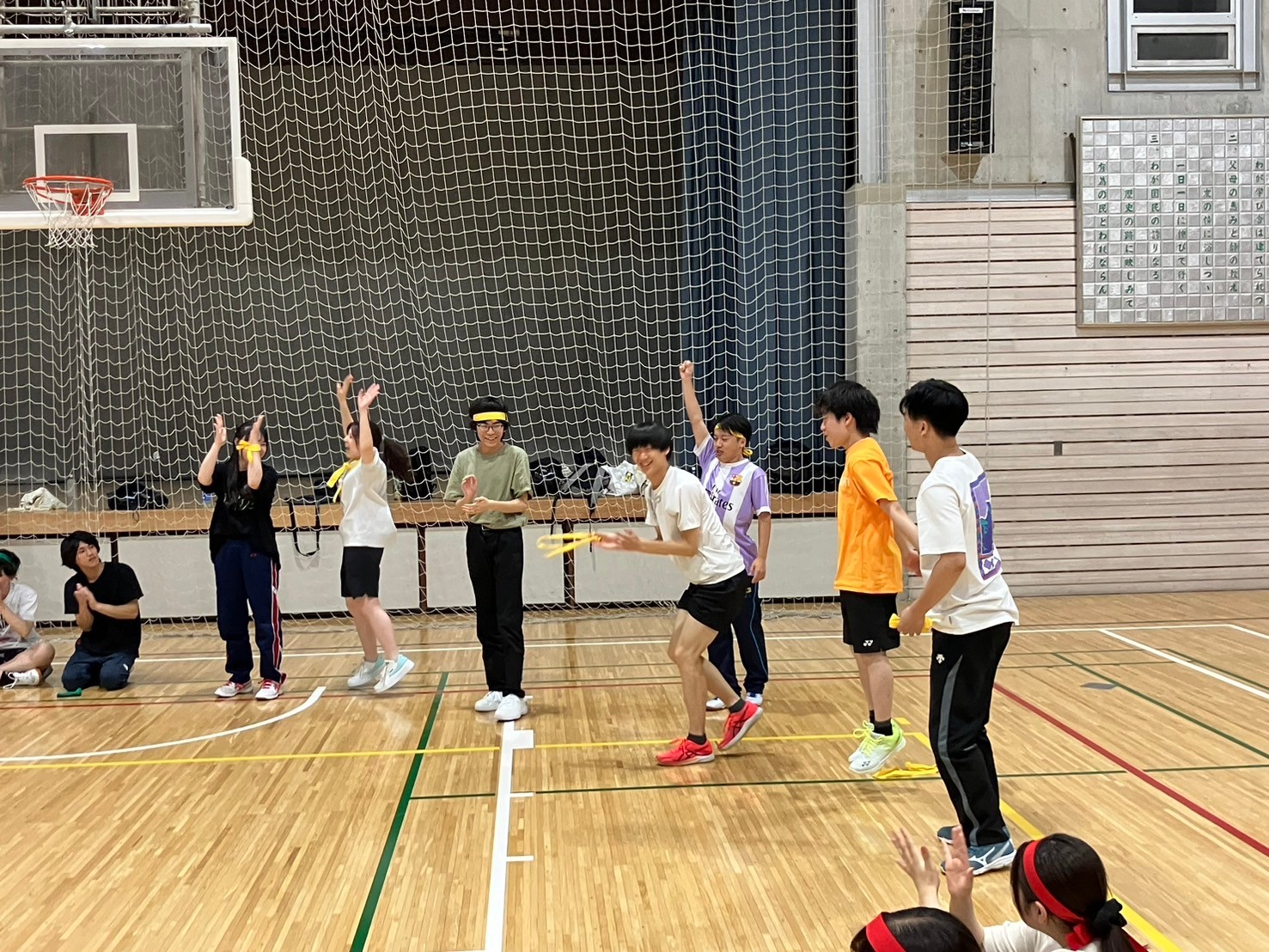 通常より小さく柔らかいボールを使ったバレーボールです。様々な独自ルールを設け、楽しみました。